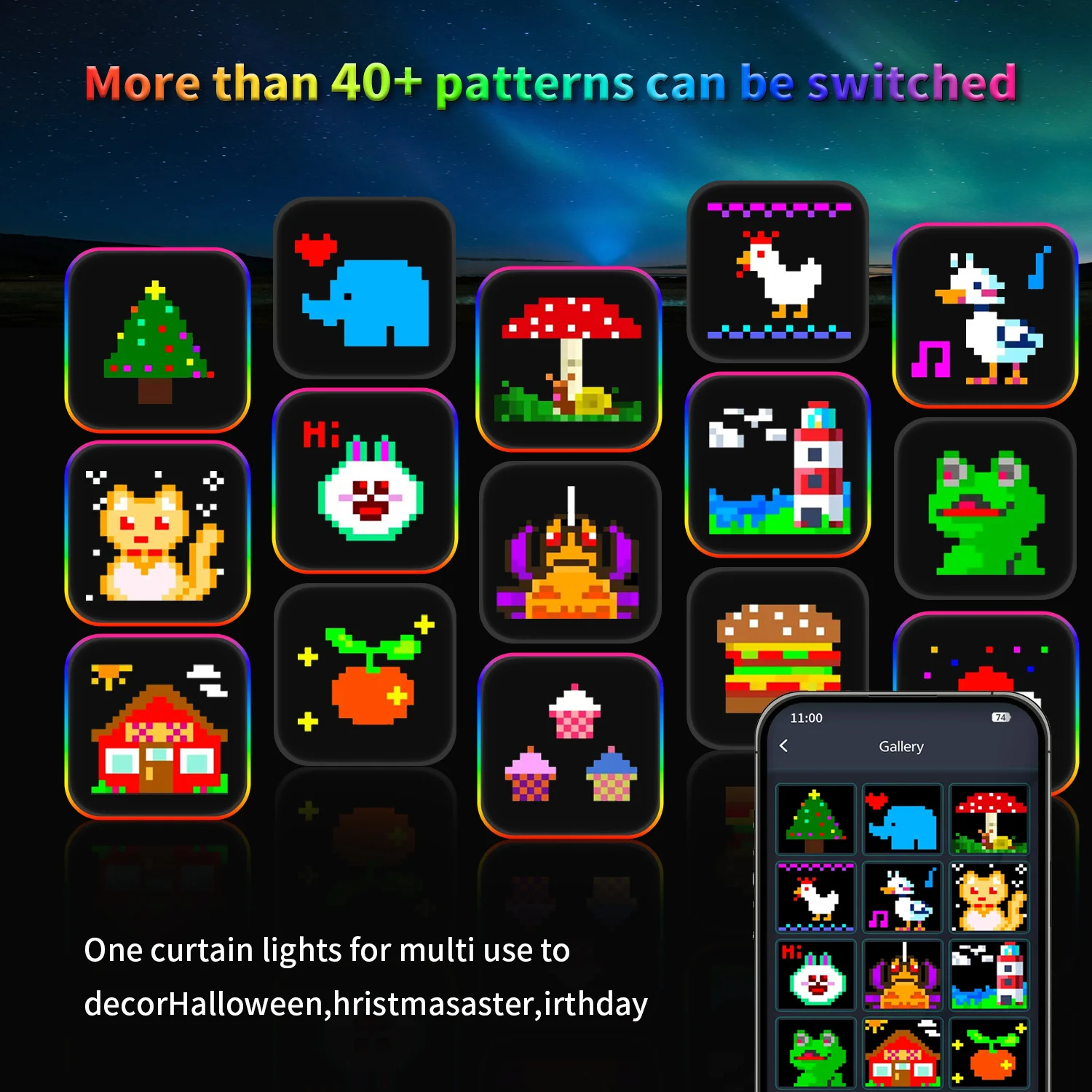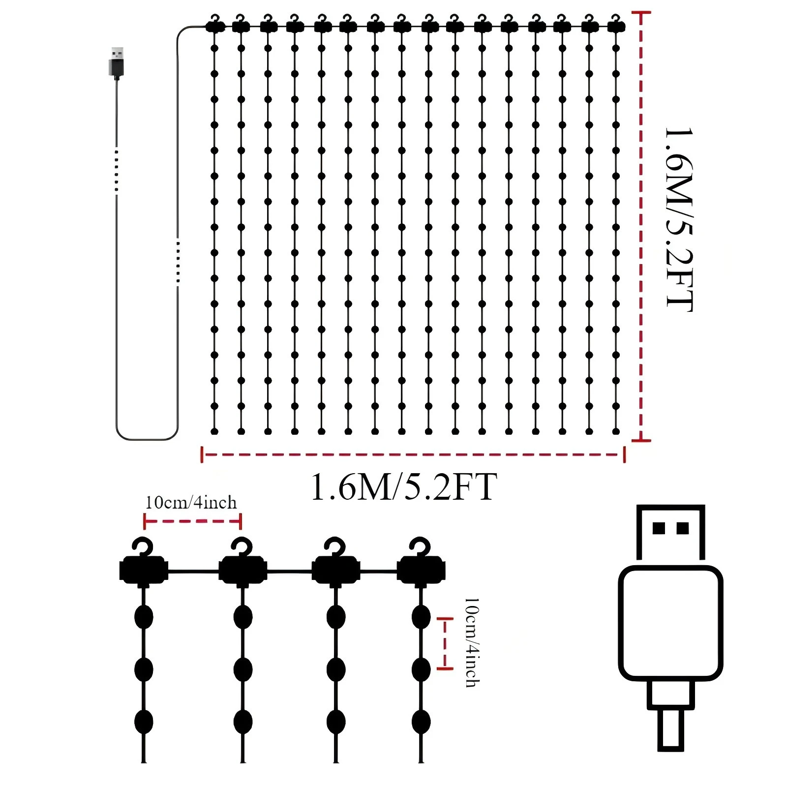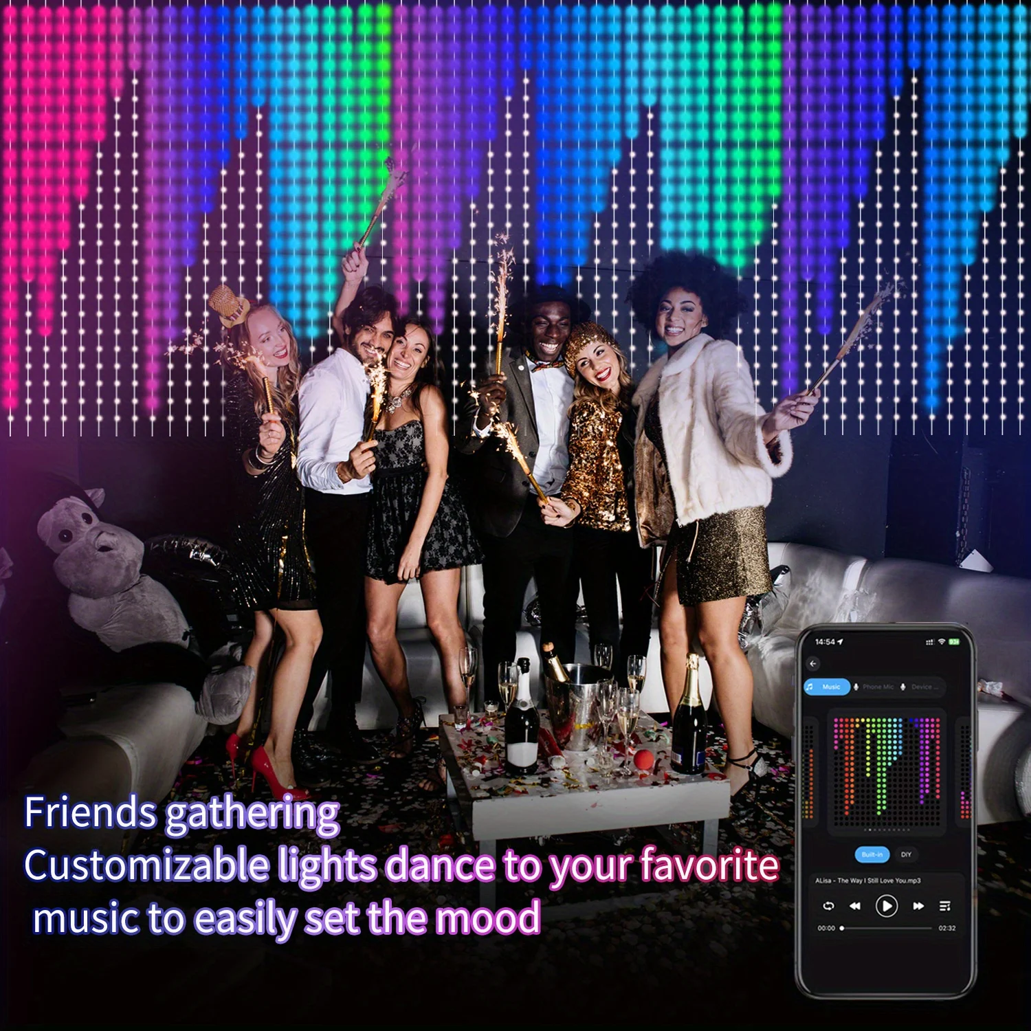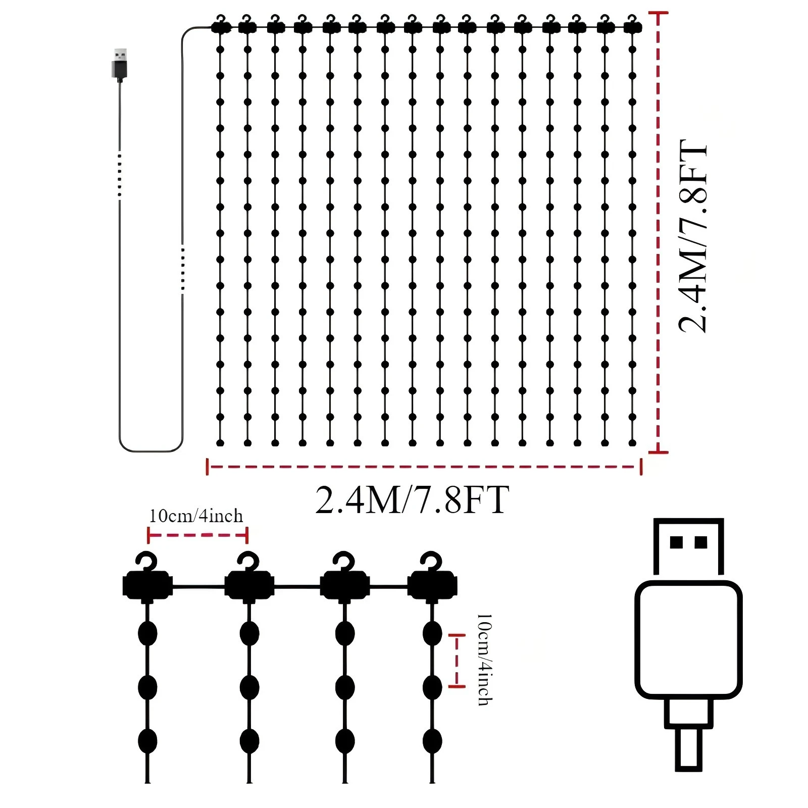 【APP Control With USB】: Smart APP controller with RGB colors, brightness, and speed. With 24 scene modes that can be randomly switched with 54 choices, and music mode, and timer. The power supply of the curtain fairy lights is the USB port, you can plug it directly into the charging bank, or use the plug with the USB port.